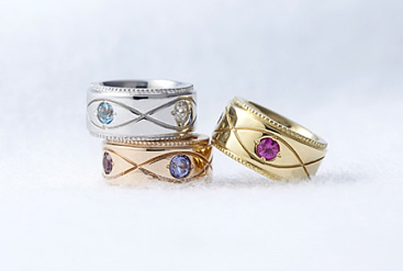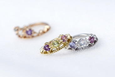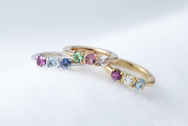 赤ちゃんの誕生石を真ん中に、それを包み込むようにママとパパの誕生石が左右に並びます。