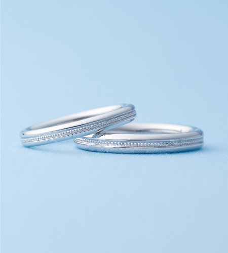 指輪のまん中をぐるりと一周する、手仕事のミル打ちは、ふたりをつなぐ糸。決して途切れることはない。50代の結婚指輪買い替えにもおすすめです。自宅で試着して重厚感をお確かめください。