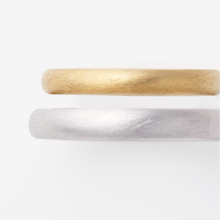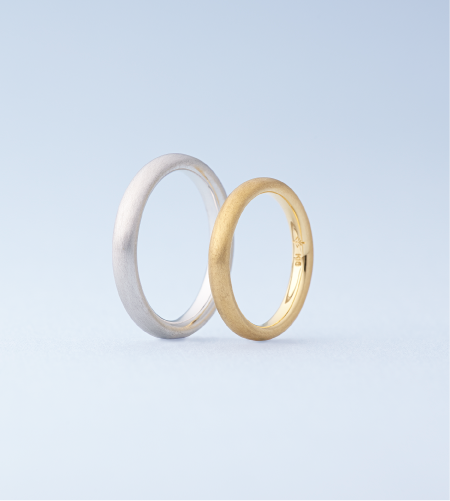 シンプルなフォルムの指輪の表面に手仕事で軽いつや消し加工。じんわりとぬくもりを感じられる50代の大人の結婚指輪です。
