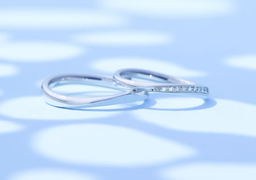 抜群の雰囲気で、純白のウェディングドレスに映える細身の結婚指輪。躍動感あふれるフォルムは、幸せな将来を約束してくれるようです。