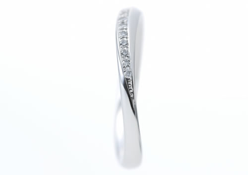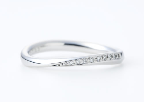 細身なウェーブライン。右側の曲線に沿って、9ピースのシングルカットダイヤモンドがセットされ、花嫁をエレガントに彩ります。シンプルな中に、可愛さも感じられるマリッジリングは、毎日眺めるたびに愛着が深まるでしょう。