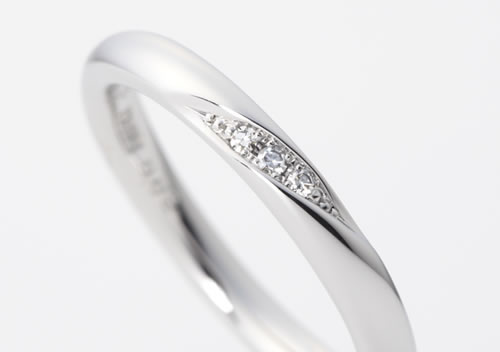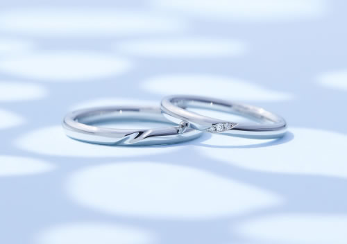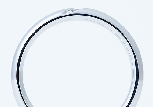 スーツや様々なワーキングスタイルにも良く似合う、いつまでの飽きのこないシンプルな結婚指輪。センターに寄り添うダイヤモンドの清楚な輝きが、幸せな日々を約束してくれるようです。