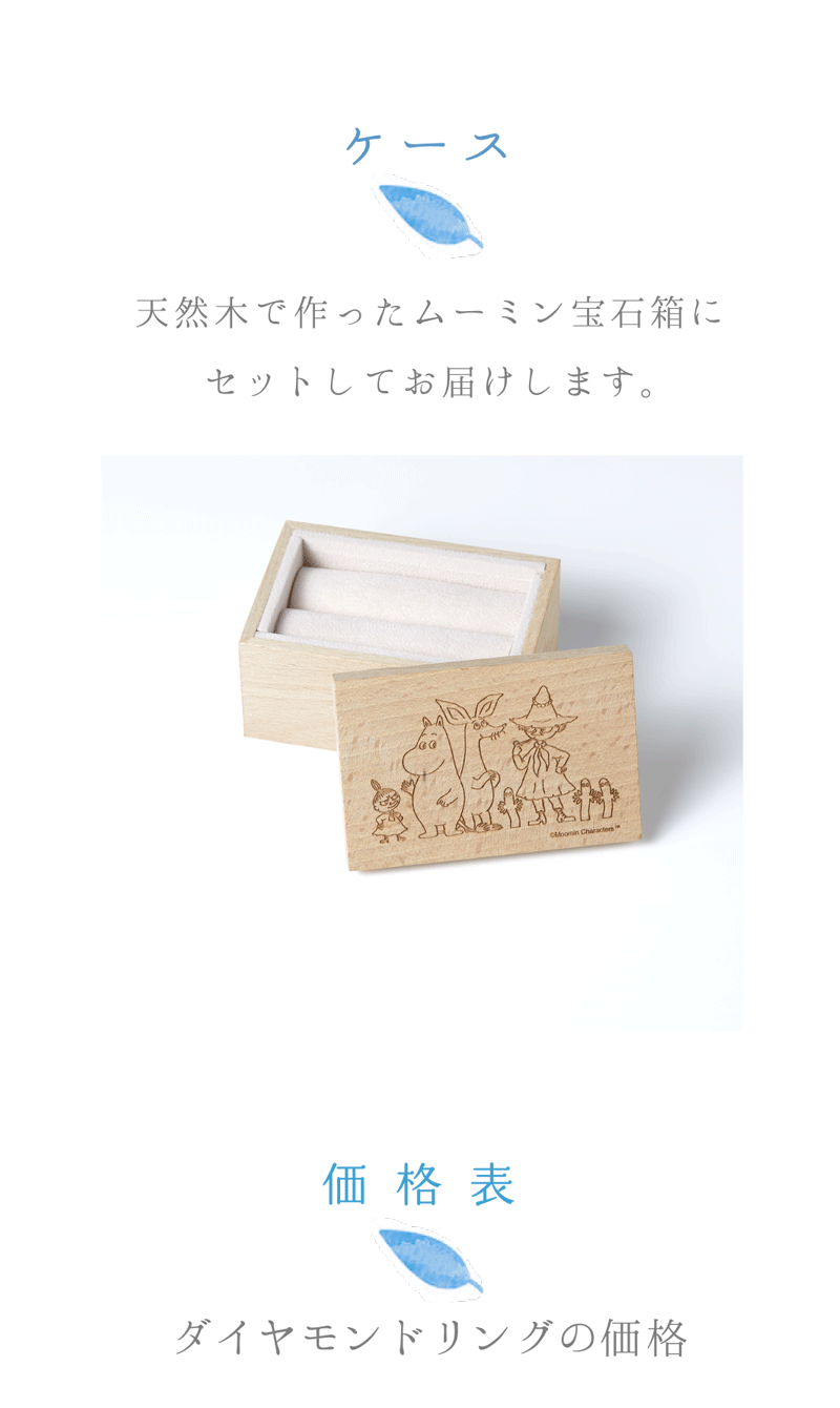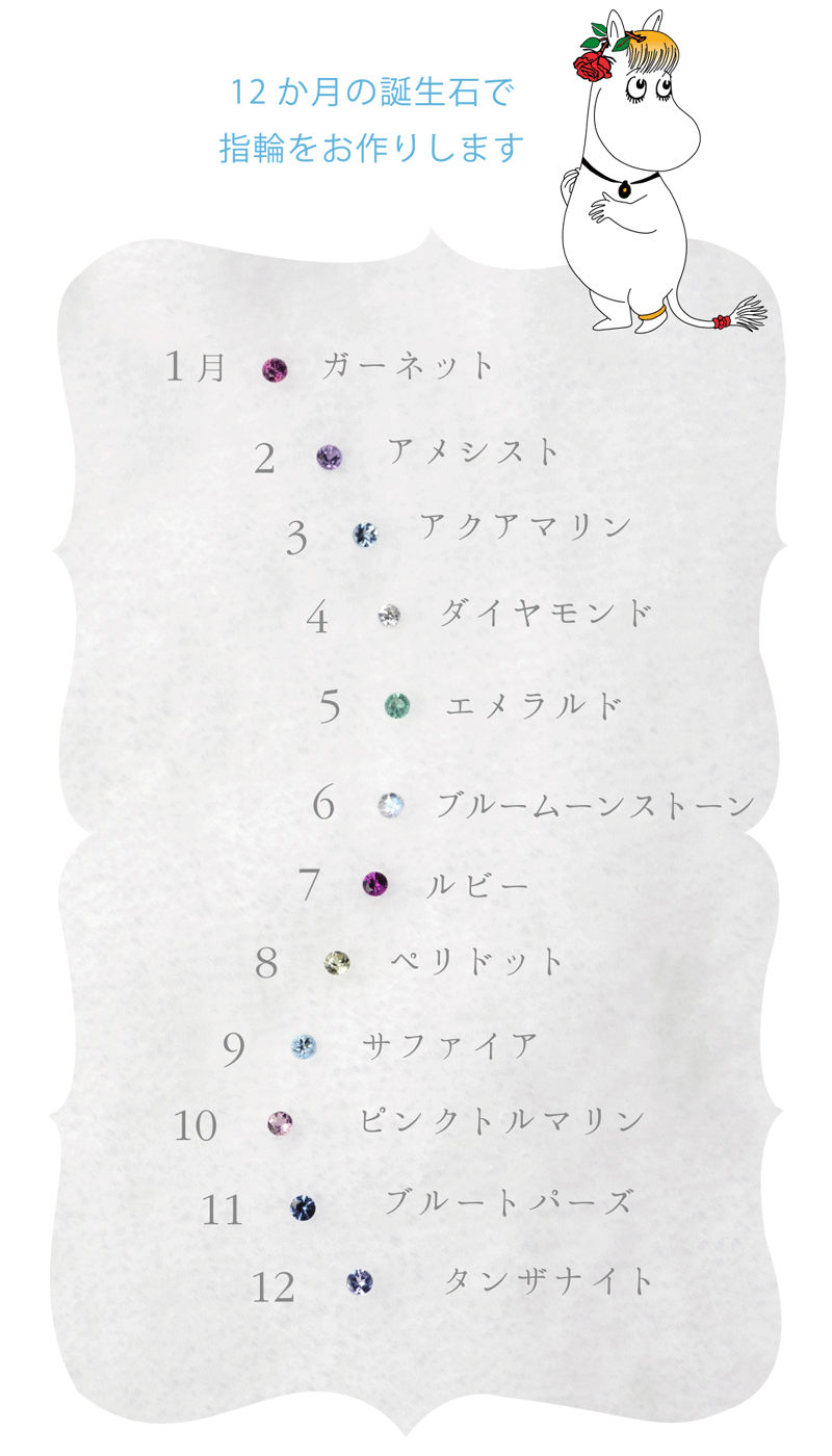 価格は税込で、全デザイン共通です。スティアーネとソールはダイヤモンドの大きさを選べ、0.25Ct以上のものには鑑定書(グレードはF・Gカラー、VSクラス、エクセレントカット)が付きます。ルパスのダイヤモンドは0.1Ctのみです。ダイヤモンドはアントワープから直輸入している上質なものです。誕生石の直径は約3ミリ(ダイヤモンドでは0.1Ct)で、宝石の鑑別書等は付きません。